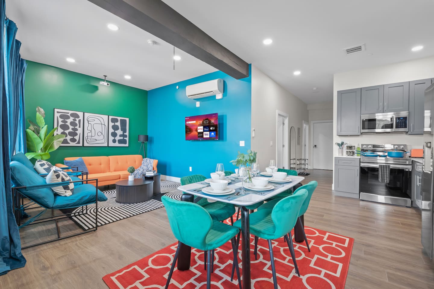 This listing features two separate apartments on the same level, perfect for larger groups or families who want to stay close together while enjoying their own private space. The space : We are delighted to introduce you to our welcoming 2-bedroom, 1-bathroom apartment (Each unit). This modern luxury retreat provides everything you need for a perfect and worry-free stay w/ your family. The combined living and dining area is furnished with modern furniture that surpasses expectations. The bedroom offers a tranquil oasis with a stunning nighttime view. Large windows flood the space with natural light, complemented the modern designer furniture for a pleasant ambiance . **2 Living Rooms:** Enjoy stylish interior design and carefully selected amenities in this charming apartment. The well-appointed space allows for easy customization to suit your needs. - Sofa, chairs with coffee table. - 55” Roku TV . - Movie projector . - Work Desk and Office Chair: Ideal for remote work or catching up on emails. - Sofa Bed: Additional sleeping space for guests, providing flexibility & comfort. **Bedroom:1 Master bedroom:** Experience comfort in the bedroom equipped with luxurious amenities for a restful stay. - Queen-size bed with luxury foam mattress, pillows, linens, and sheets. - Full size mirror. - Closet Space. - Reading lamps. **Bedroom:2 For the younger ones** - Bunk bed (Twin XL on top of Queen) size bed with luxury foam mattress, pillows, linens, and sheets. - Closet Space. - Reading lamps. - Kids toys and books. ** Bedroom 3 ** - Queen-Size Bed: Luxuriate in a queen-size bed with a luxury foam mattress, premium pillows, linens, and sheets for a restful night's sleep. - Shelf Space: Storage to keep your belongings organized. - Reading Lamps: Convenient lamps for nighttime reading or ambient lighting. ** Bedroom 4 ** - Queen-Size & Twin Bunk Bed: Designed with Kids in mind, but adults can enjoy the playfulness theme. Luxuriate in a queen-size bed with a luxury foam mattress, premium pillows, linens, and a Twin Bed on top making it a memorable experience for kids. - Shelf Space: Storage to keep your belongings organized. - Reading Lamps: Convenient lamps for nighttime reading or ambient lighting. - Book Rack: Fun Kid's books & Board Games are located. - Star/Galaxy Lamps: Make the light glow in a star and galaxy-style theme room for the night. With a built-in speaker and changing lights based on music. ** 2 Bathrooms: ** The inviting full bathroom is stocked with all essential toiletries, ensuring a hassle-free stay . - Bath with shower. - Wash basin. - Mirror. - Toilet. - Towels. - Essential toiletries. **Kitchen & Dining:** The apartment features a fully equipped kitchen where you can easily prepare delicious meals. Its spacious layout and modern amenities exceed expectations for a 4-bedroom apartment. - Dining for ten . - Oven. - Stove. - Refrigerator/Freezer. - Dishwasher. - coffee maker. - Sink with hot & cold water . - Glasses, silverware, pots & pans. Your health, safety, and well-being are our top priorities, and we maintain thorough cleaning procedures after each guest's departure . If your preferred dates are unavailable, please check our profile for more listings in the city Come experience this stunning 4-bedroom apartment. We look forward to welcoming you! Note: If there is no prior trip history, a background check form may be required .