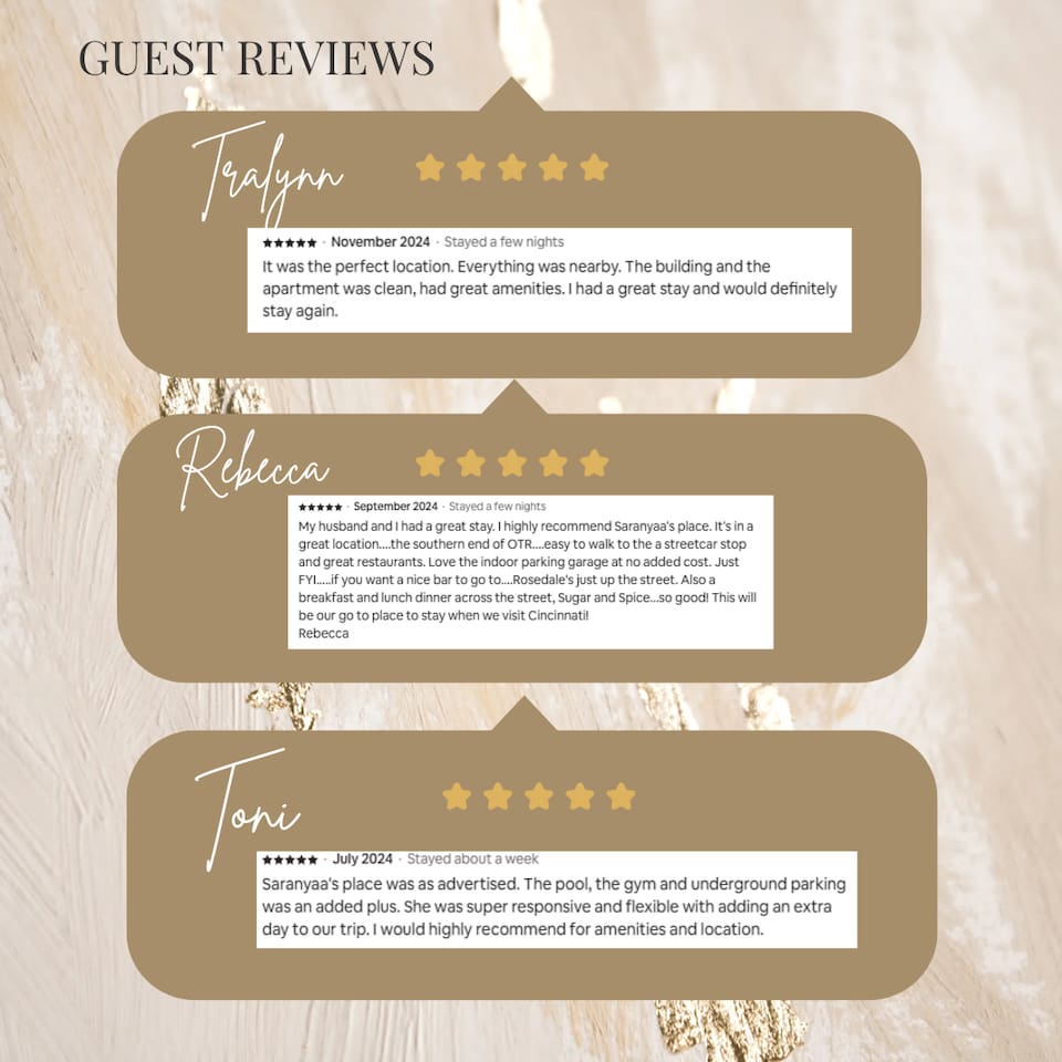 This 1 bedroom oasis is exactly what you need for a peaceful trip to Cincinnati! In Over-The-Rhine (OTR) and Central Business District (CBD) with luxury finishes & an unmatched amenities collection Pool/Gym/Outdoor Patio/BBQ Grill /Pool Table Walkable to Hard Rock Casino, to many other restaurants, bars, and breweries. Mins to Ziegler Park, Paycor Stadium, and Great American Ball Park Background check and Government ID required ALL GUESTS will need to fill out the background check for.